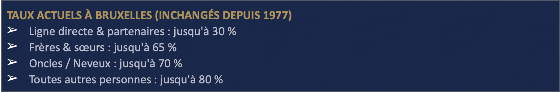 Le diagnostic qui sous-tend la proposition est cependant largement partagé : les barèmes bruxellois sont restés inchangés et non indexés depuis 1977. Les taux actuels sont les suivants :